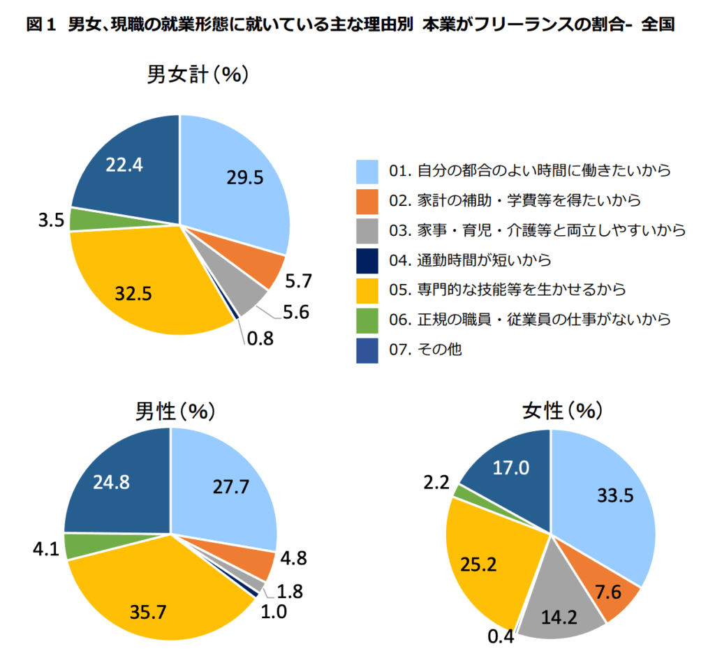 さらに注目すべきは、女性が本業としてフリーランスを選んだ主な理由として、「自分の都合のよい時間に働きたいから」が最も多く挙げられています。